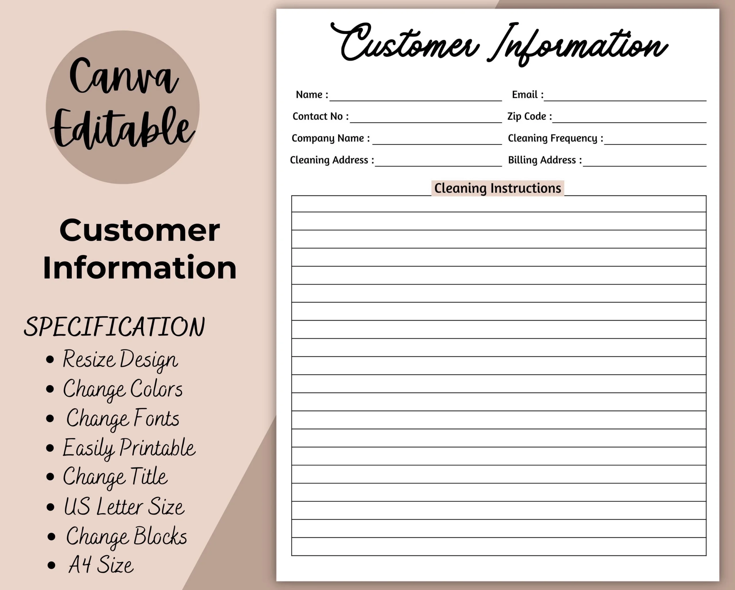 Customer Information Template Printable Customer Info Log Cleaning Service Business Planner Client Info Sheet Client Intake Template Etsy