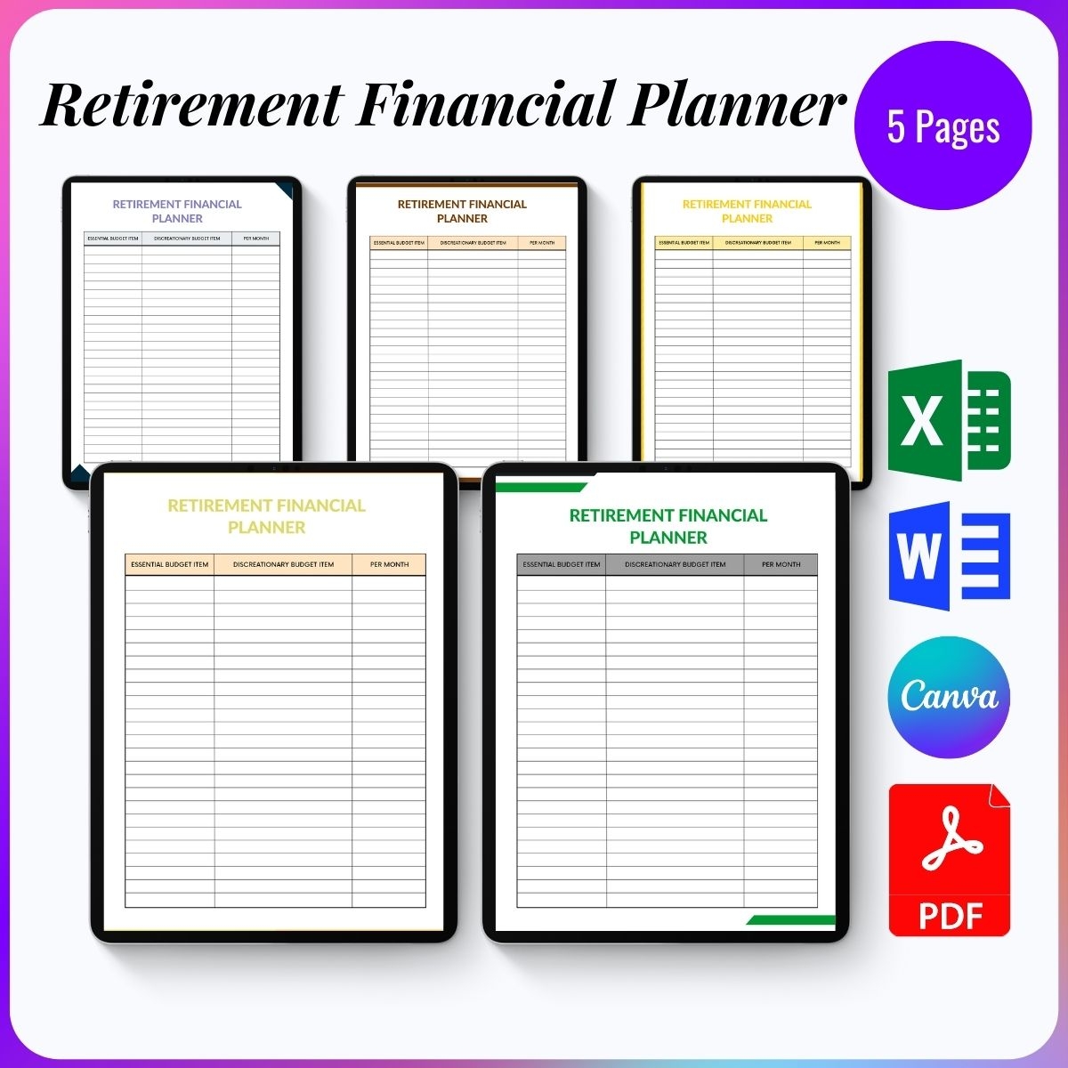 Retirement Financial Planner Printable Template PDF Excel